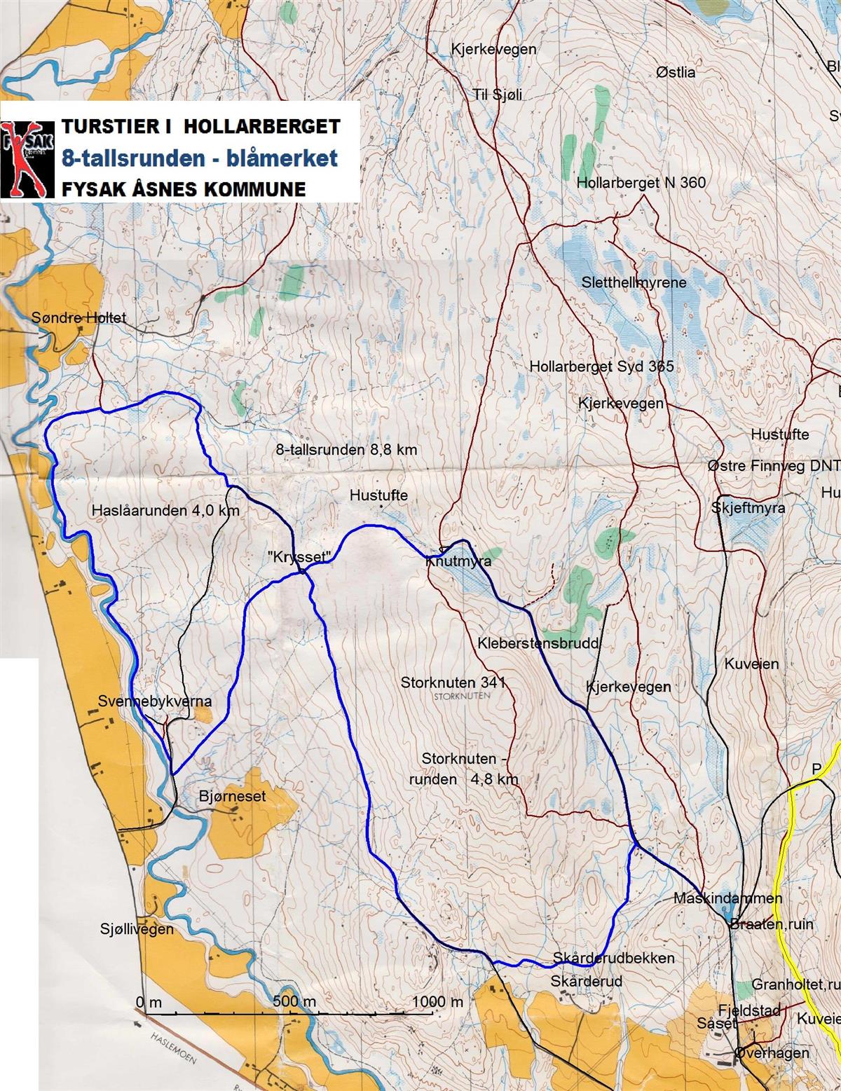 Stien er blåmerket. Starter man ved Maskindammen, følger man veien 500 m til «8-tallet» begynner.