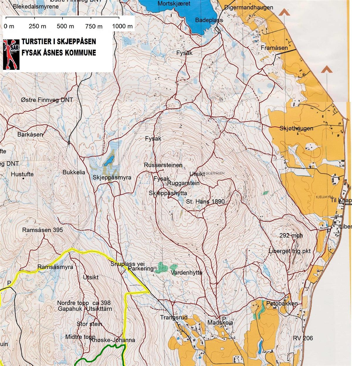 Stiene i Skjeppåsen er ikke fargemerket. Stiene som er merket brune på kartet er tydelige i terrenget.